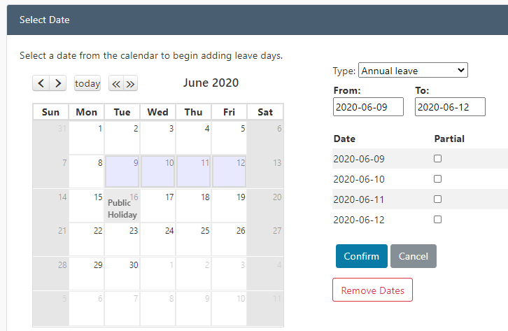 If you recorded a group of 4 leave days initially and now click Remove Dates, it will delete the entire grouping of 4 days. Therefore, if you wish to cancel only 1 day, you will first have to delete the entire grouping and then re-record the 3 leave days that were actually taken.